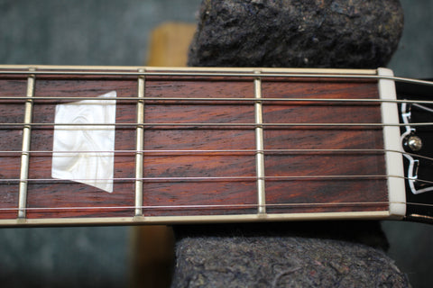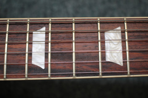 A rosewood fretboard with acrylic trapezoid inlays and 22 medium jumbo frets
