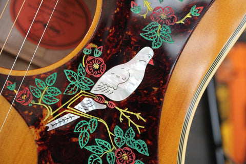 The Dove is richly and iconically ornamented. The body features multi-ply top and back binding. The dove-shaped rosewood bridge plate has two mother-of-pearl dove inlays. It is equipped with a compensated bone saddle, and the nut and bridge pins are also bone. The iconic Dove pickguard features a mother-of-pearl dove. On the headstock, Kluson® Waffleback tuners with metal Keystone buttons help ensure solid tuning stability. The headstock features a two-ply white and black truss rod cover engraved “DOVE,” and the Epiphone logo and Gibson Crown are inlaid in aged mother-of-pearl. The headstock features a Gibson-style “open book” profile with the Inspired by Gibson Custom double diamond logo etched on the rear.