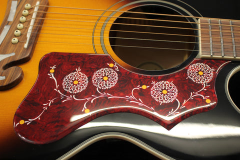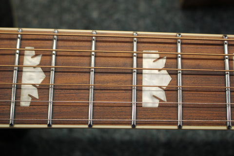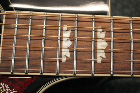 The J-200 EC pays homage to the King of the Flattops - the classic Gibson SJ-200. This Inspired by Gibson Epiphone features a cutaway Super Jumbo body with select maple back and sides, solid spruce top for outstanding tone, a smooth-playing hard maple neck with a SlimTaper D profile, pau ferro fretboard, 20 medium jumbo frets, and classy pearloid crown inlays. The bridge has the legendary Moustache shape, and the pickguard features iconic J-200 graphics. Comes equipped with a Fishman Sonicore under-saddle pickup and Presys preamp with built-in tuner. (Previously called Epiphone EJ-200SCE Acoustic/Electric)
