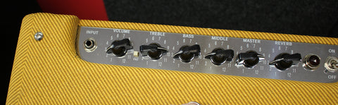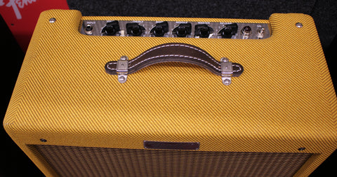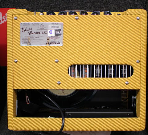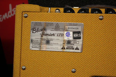 The Blues Jr. Lacquered Tweed takes Fender's 15W gem and gives it the true vintage treatment with a lacquered tweed covering and a vintage-voiced 12" Jensen speaker. Its golden tones are generated by an all-tube signal path using a pair of EL84 output tubes and 3 - 12AX7 preamp tubes. Add renowned Fender reverb, flexible controls, FAT switch for mid boost, and you're in business. And just look at that chrome panel, that tweed finish with vintage-style brown and gold grille cloth, and those vintage pointer knobs!