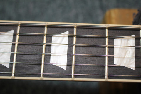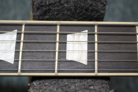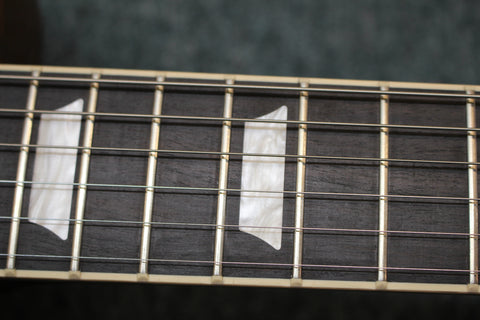 A bound ebony fretboard with acrylic trapezoid inlays