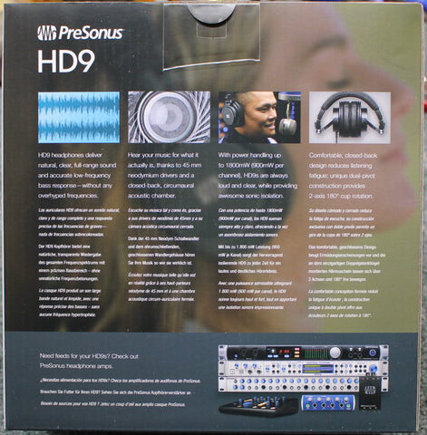 PreSonus HD9 professional studio headphones feature 45 mm dynamic, neodymium drivers in a closed-back acoustic design that provides superior listening isolation and reduces headphone bleed. Its tailored frequency response extends all the way from 10 Hz to 26 kHz, with accurate bass response, enabling precise mixes. The HD9 offers high power handling (900 mW per channel into 40 ohms) while providing comfort, durability, and reduced listening fatigue.