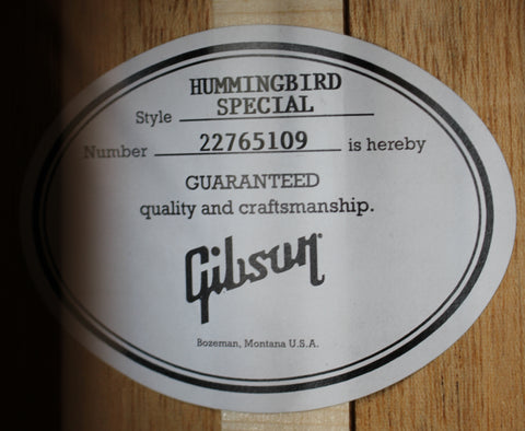 First introduced in 1960, the Gibson Hummingbird is one of the most distinctive and well-loved acoustic guitars ever made. Handcrafted with care in Bozeman, Montana, by Gibson’s expert acoustic luthiers, the new Gibson Hummingbird Special offers players a USA-built Gibson Hummingbird model at a very attractive price. The Hummingbird Special has a traditional square-shouldered body constructed using genuine solid mahogany for the back and sides and a solid Sitka spruce top that is reinforced with our traditional scalloped X-bracing. This combination of tonewoods delivers a warm, balanced tone with excellent dynamic range that is perfect for any style of music. The “concert depth” body is slightly thinner than the body on a Hummingbird Standard, giving it a leaner and tighter bass response that sits perfectly in the mix and also makes it easier to hold. The utile neck is attached to the body with a compound dovetail neck-to-body joint, and like all Gibson acoustic guitars, it is affixed with hot hide glue. The neck has a comfortable Round profile, and the rosewood fretboard has a 12” radius and features pearloid parallelogram inlays, which is one of the visual hallmarks that makes the Hummingbird easily recognizable. The fretboard is fitted with 20 standard frets. The traditional belly-up rosewood bridge is equipped with a TUSQ saddle, and the nut and bridge pins are also TUSQ. High-quality Grover Rotomatic tuners ensure rock-solid tuning stability. The pickguard features a simplified version of the world-famous Hummingbird pickguard graphics. The Hummingbird Special is finished in satin nitrocellulose lacquer in Satin Vintage Cherry Sunburst. It comes equipped with an L.R. Baggs Element Bronze under-saddle piezo pickup and active preamp with an easily accessible soundhole-mounted volume control, so it’s stage and studio-ready from the moment you take it out of the included premium soft-shell case.